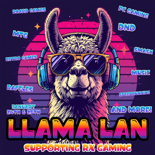 A Two-Day Gaming Extravaganza Benefiting RX Gaming. Get ready to power up your PCs, roll the dice, and game for a great cause! Llama LAN is a massive, two-day gaming fundraiser benefiting RX Gaming, a fantastic charity dedicated to breaking down barriers to gaming. Whether you're a hardcore competitive gamer, a casual board game enthusiast, an MTG master or just looking for a fun weekend, join us for a weekend of non-stop action, community, and charity!