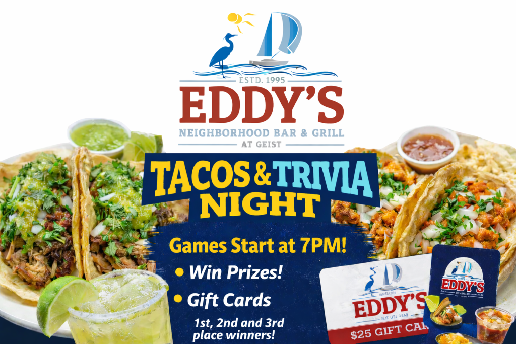Have a family fun night at Eddys Neighborhood Bar & Grill! Trivia starts at 7pm and is free to play. Enjoy a round of Music Bingo at halftime and compete for 1st, 2, and 3rd place prizes! Fill up with delicious tacos, crafted in our kitchen with the freshest ingredients and enjoy a wholesome, fun-filled night!