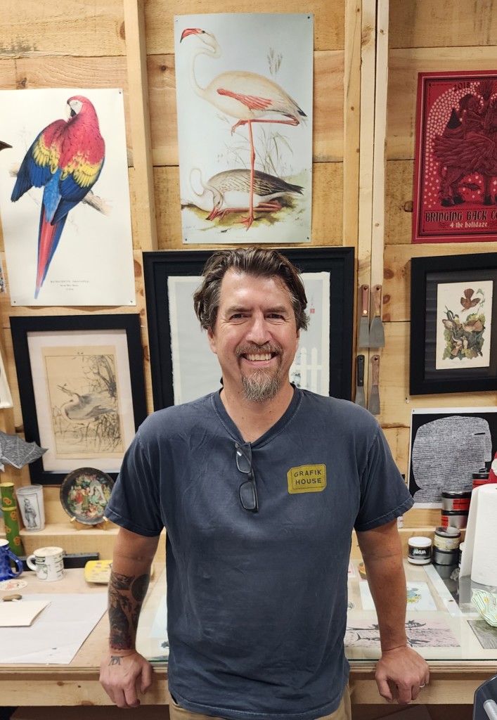 His striking, detailed pieces evolve from a complex process that he says demands drafting/drawing skills, woodworking skills, manic attentiveness during the printing process, and a healthy dose of luck.