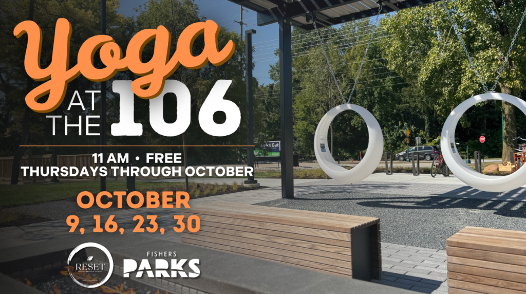 Free yoga on Thursdays through October 2025! Recently opened, The 106 Plaza is a new community gathering space located at the intersection of the Nickel Plate, Cheeney Creek, and The 106 trails, just outside of the Fishers Parks HQ and Maker Playground.
