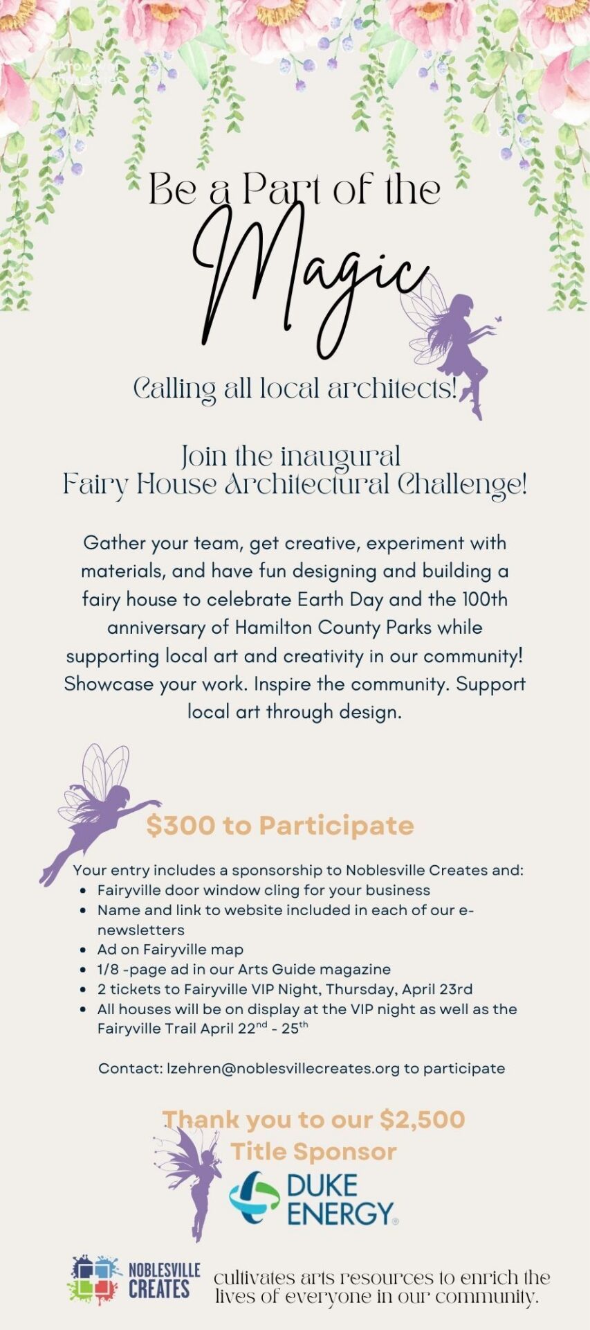 Thank you for your interest! We can’t wait to see your fairy architectural skills. For questions, comments, or more information, contact us at info@noblesvillecreates.org or 317-452-3690.