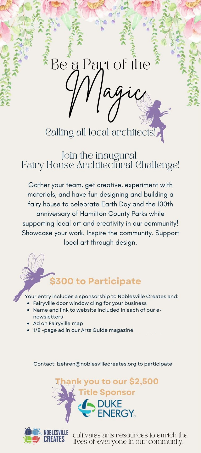 Thank you for your interest! We can’t wait to see your fairy architectural skills. For questions, comments, or more information, contact us at info@noblesvillecreates.org or 317-452-3690.